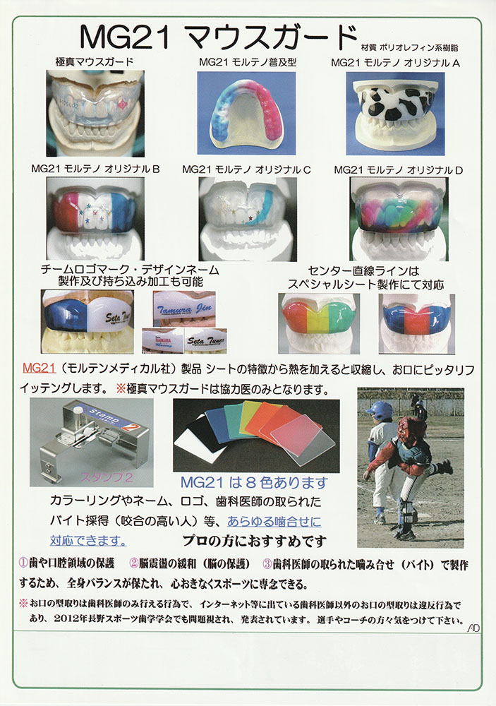 プロの選手は無論のこと、若年から壮年、年齢、スポーツの種類問わず、スポーツ時心身共に心置きなく、安心してスポーツに専念出来る事を願い、ポール式マウスガード研究会を発足させました。