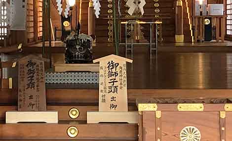 境内式内摂社「角鹿神社」の本殿内に奉安され、古来、国内に災禍が起こると出御し、混乱を鎮めてきたきた「獅子頭」が出御となりました。コロナウィルスという疫病が国内にまん延する今、角鹿神社御社殿改修(昭和44年)以来約50年ぶりの出御となります。